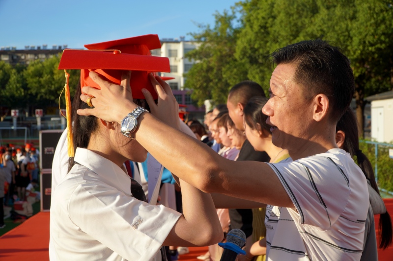 仪式上,全体学生家长给自己的孩子戴上成人帽,为已满十八岁的青年学生加冠及笄;学生和家长之间互赠礼物,孩子向父母表达感恩之情,父母为孩子送上美好祝愿。随后,学生们头戴成人帽在学校领导的带领下与家长一起庄严跨过成人门,宣告自己成年。副校长向青年学子们提出了殷切希望:十八而志,大任始承;心里有家国,肩上扛责任,要以优异的成绩和实际行动谱写青春华章。全体学生举起右拳宣誓,许下他们青春的铮铮誓言。