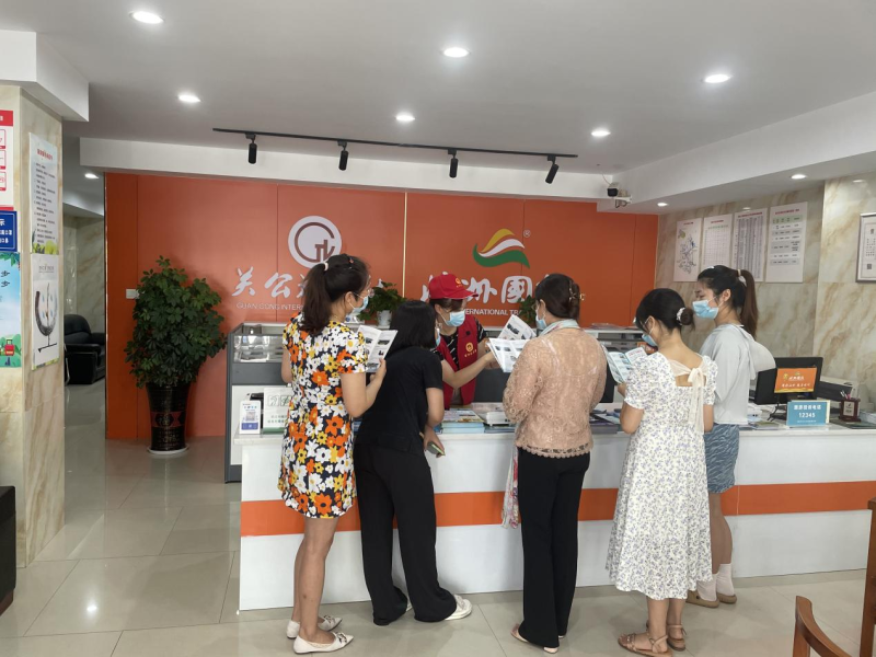 在关公文化旅游社,导游正为咨询完旅游业务的游客讲解文明旅游及疫情防控知识,现场发放文明旅游手册,呼吁广大游客朋友在假期出行过程中养成良好的文明出行习惯。