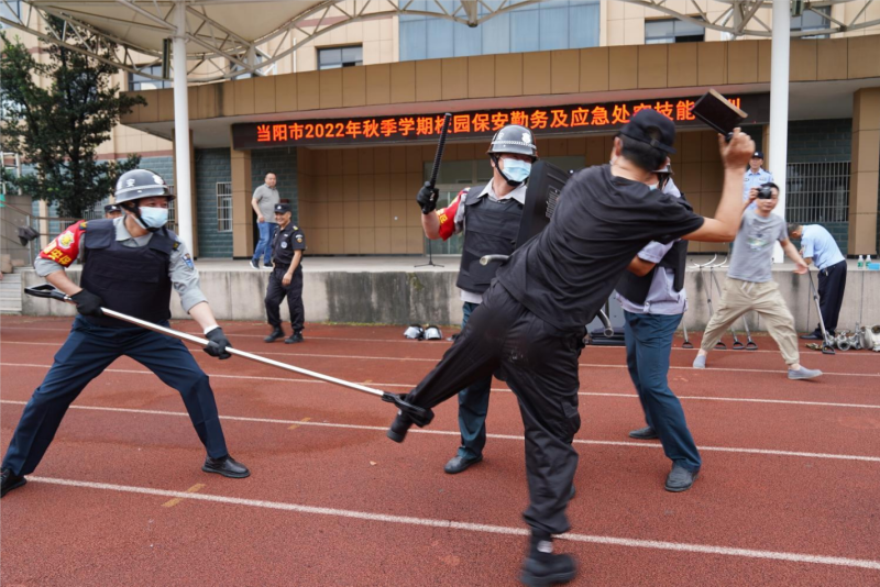 在演练培训现场,教官对安保队员进行了校园安保值勤知识讲解,就校园消防设施设备维护、器械使用等方面进行培训,对不法分子持刀冲击校园的应急处置情况进行了模拟演练。