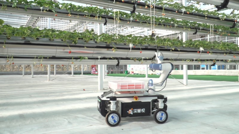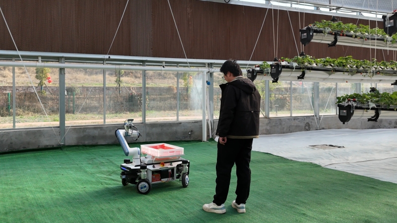 大棚内,技术人员目光专注地紧盯屏幕上实时跳动的运行数据,随时掌控机器人作业状态。伴随着轻微的机械运转声,身高不足一米的采摘机器人,凭借搭载的视觉识别系统,捕捉草莓特征,根据转色面积快速精准锁定成熟果实,柔性机械臂缓缓伸展、轻柔夹取,一颗颗草莓便被稳稳送入收纳盒中。
