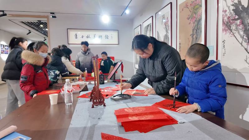 与此同时,市图书馆举办的亲子读书会也吸引了众多家庭参与。家长与孩子一起共话年俗、朗诵诗文,在亲切互动中共度温暖时光。大家还走进季士林美术馆参观摄影美术作品展,通过影像与绘画感受家乡的发展变化。馆内还设置了年画拓印、写福字等传统年俗体验活动,孩子们亲手制作出一幅幅吉祥图案和一个个饱满的“福”字,在笔墨之间感受传统文化的魅力。